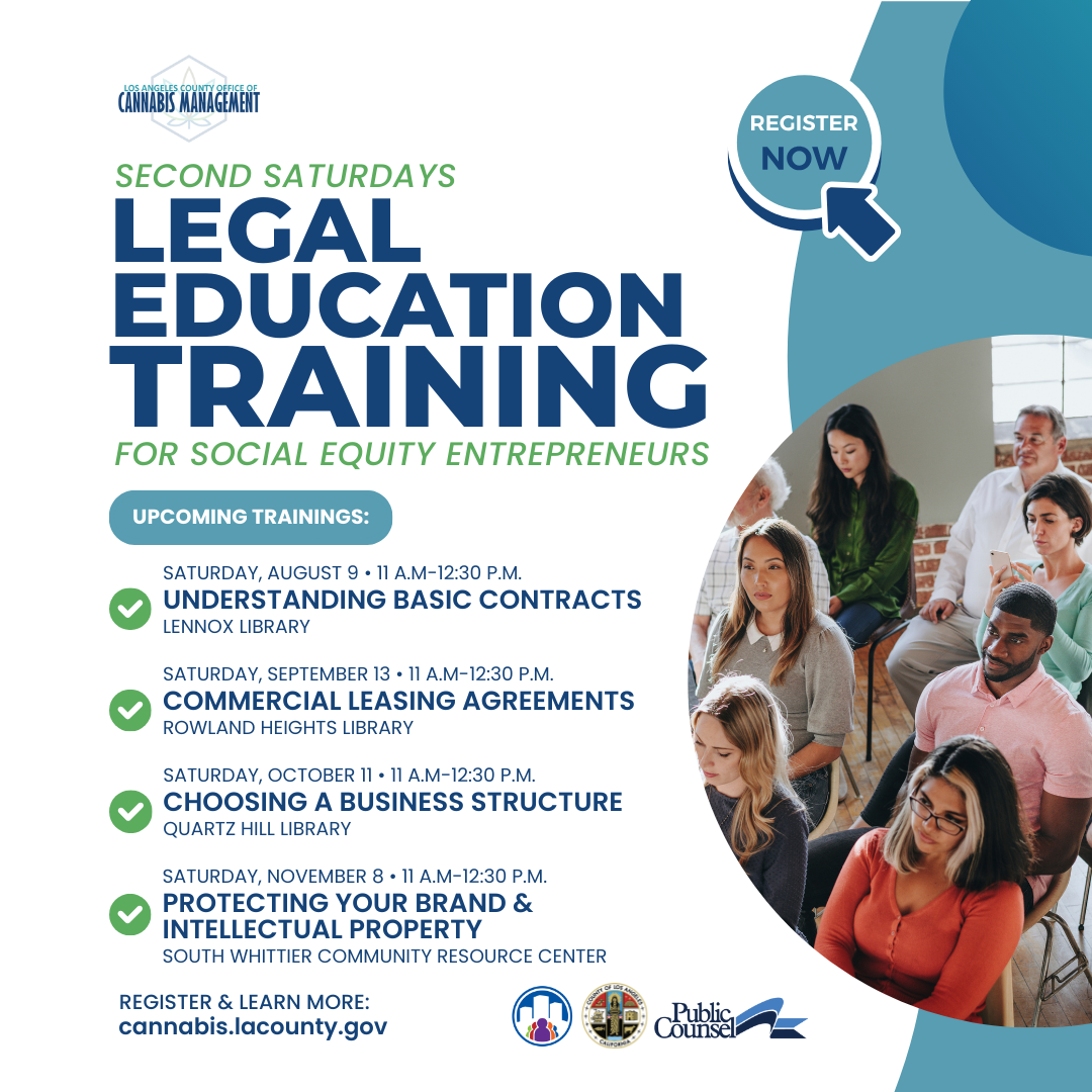 Join LA County OCM for Second Saturdays Legal Education Trainings, a free legal education training series designed specifically to protect and empower potential social equity entrepreneurs interested in launching a business in the commercial cannabis market. These trainings are your first step toward gaining essential legal knowledge and practical tools needed to prepare for entering the evolving legal cannabis marketplace.